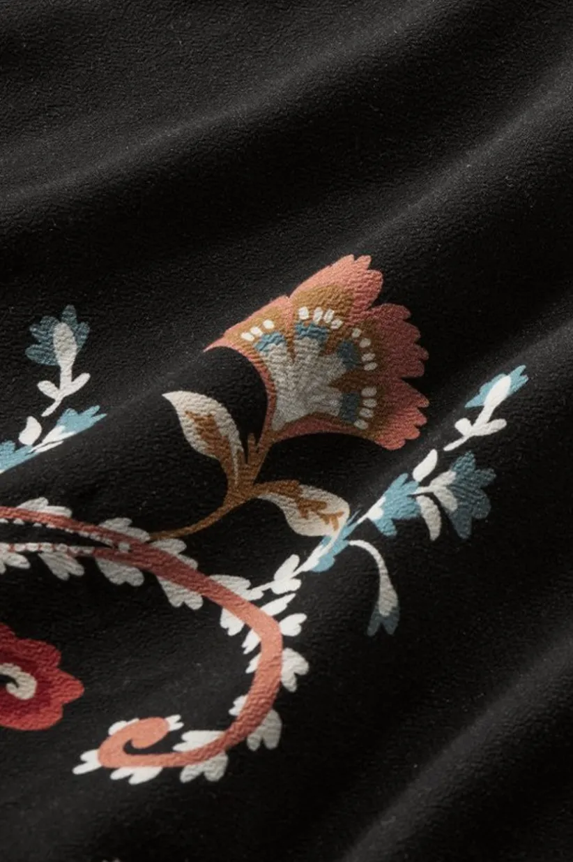 We took this tunic up a notch with a vibrant floral-paisley print, artfully placed along the split neckline, sleeves and…