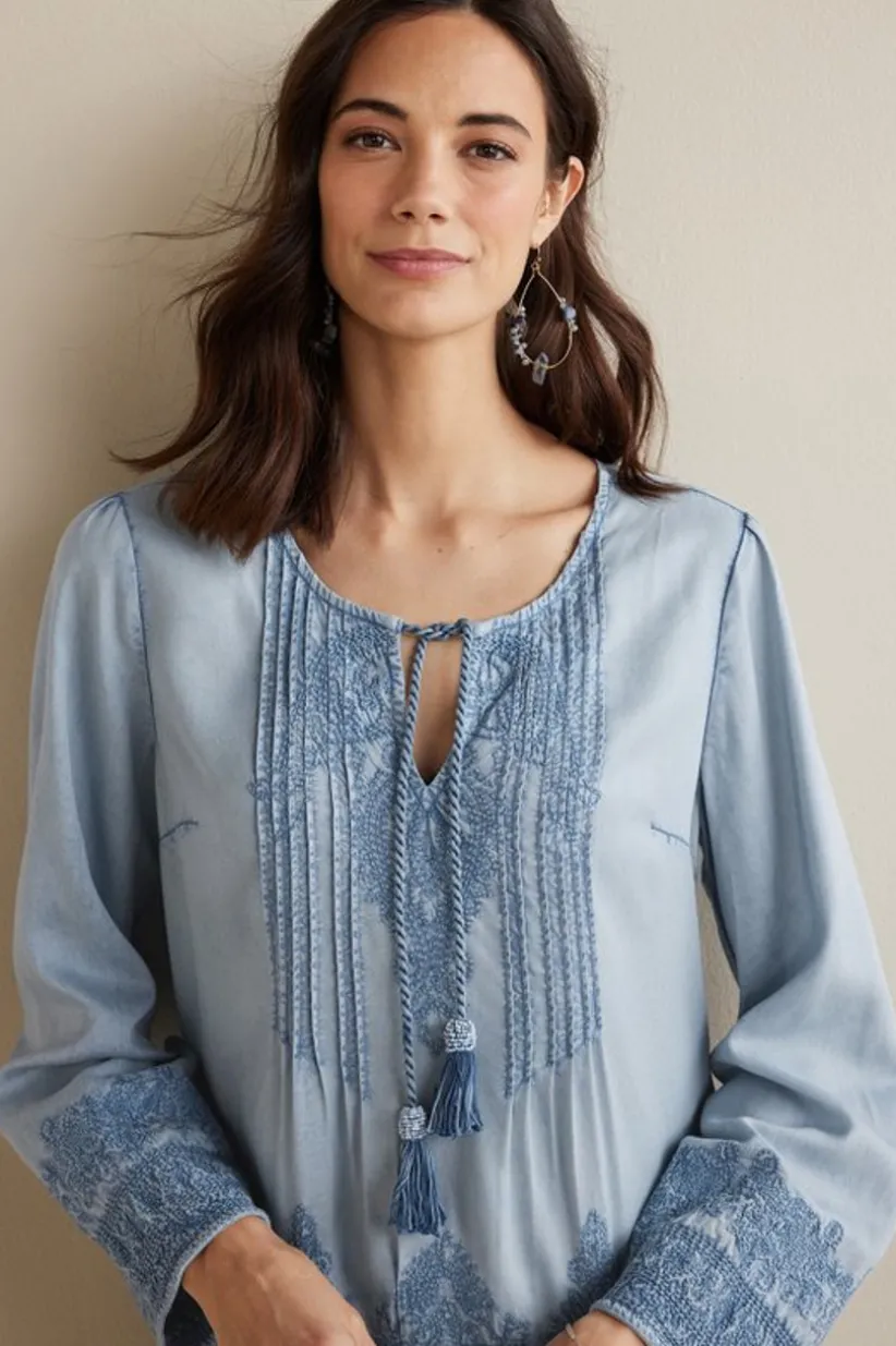 Made from pure TENCEL™ lyocell (a lighter, drapier, softer version of denim), this easy top features a split neckline with a tasseled drawstring. Pintuck details and ornate embroidery elevates this style’s flowy silhouette. TENCEL™ is a trademark of Lenzing AG.