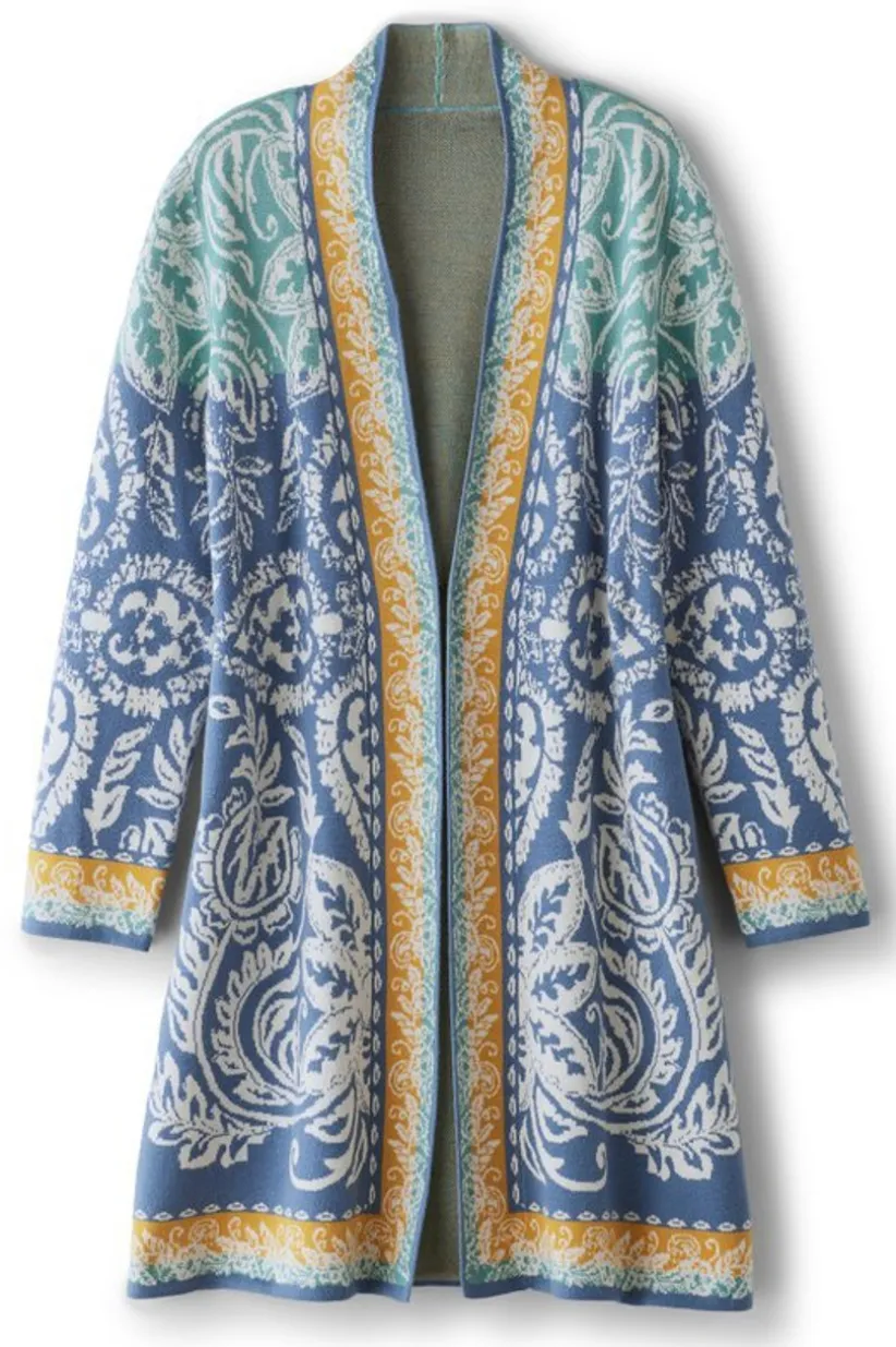 Drawn in by the swirls of color, you’ll stay for the softest jacquard. Wear it open or closed with the thread-wrapped hook and eye closure. Pockets too, of course. Layered over white and paired with denim, just watch those prints and hues pop.