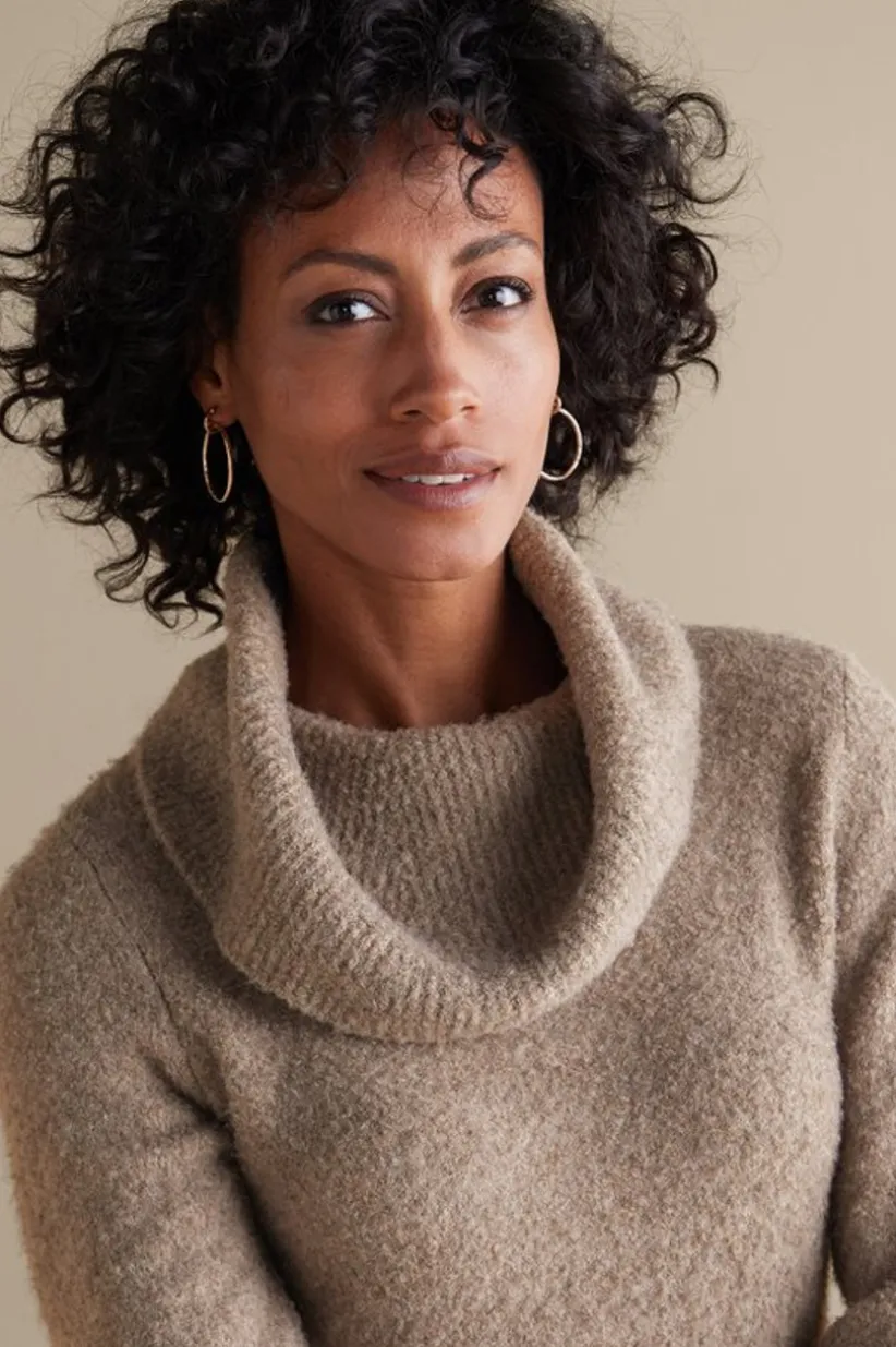 When we say this sweater dress is soft, we mean its sooooooft. Sumptuously cozy with a touch of stretch, the turtleneck style is so cute with boots and jewels, but easy enough for cozying up on the couch. High side slits.