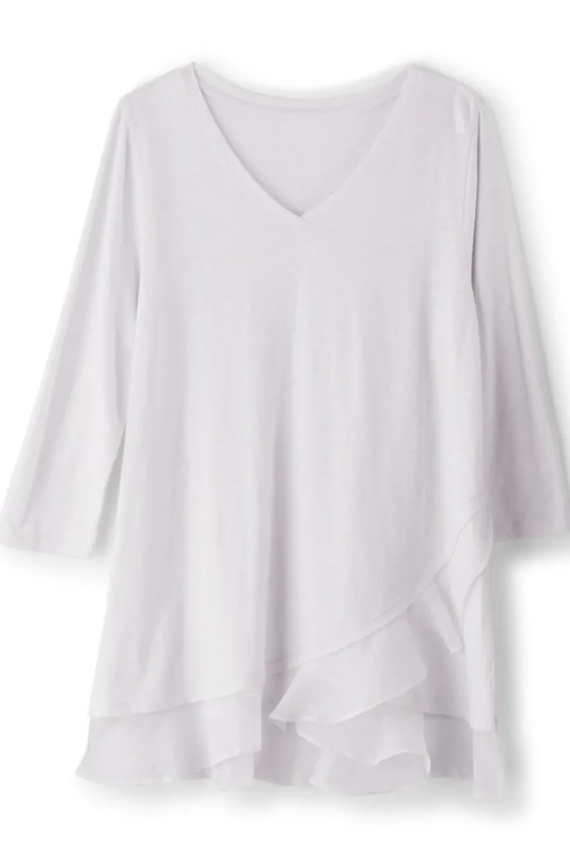 You’ll live in this wear-anywhere-with-everything comfy knit top, which has great bounce at the layered hem. V-neck and 3/4-length sleeves.