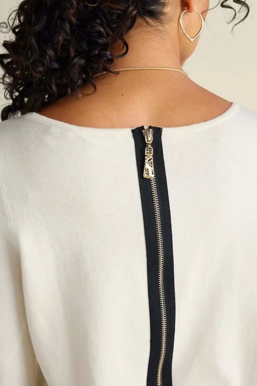 It’s all in the details. This easy scoop neck has buttons on the long sleeves and an oversized, decorative zipper at the…
