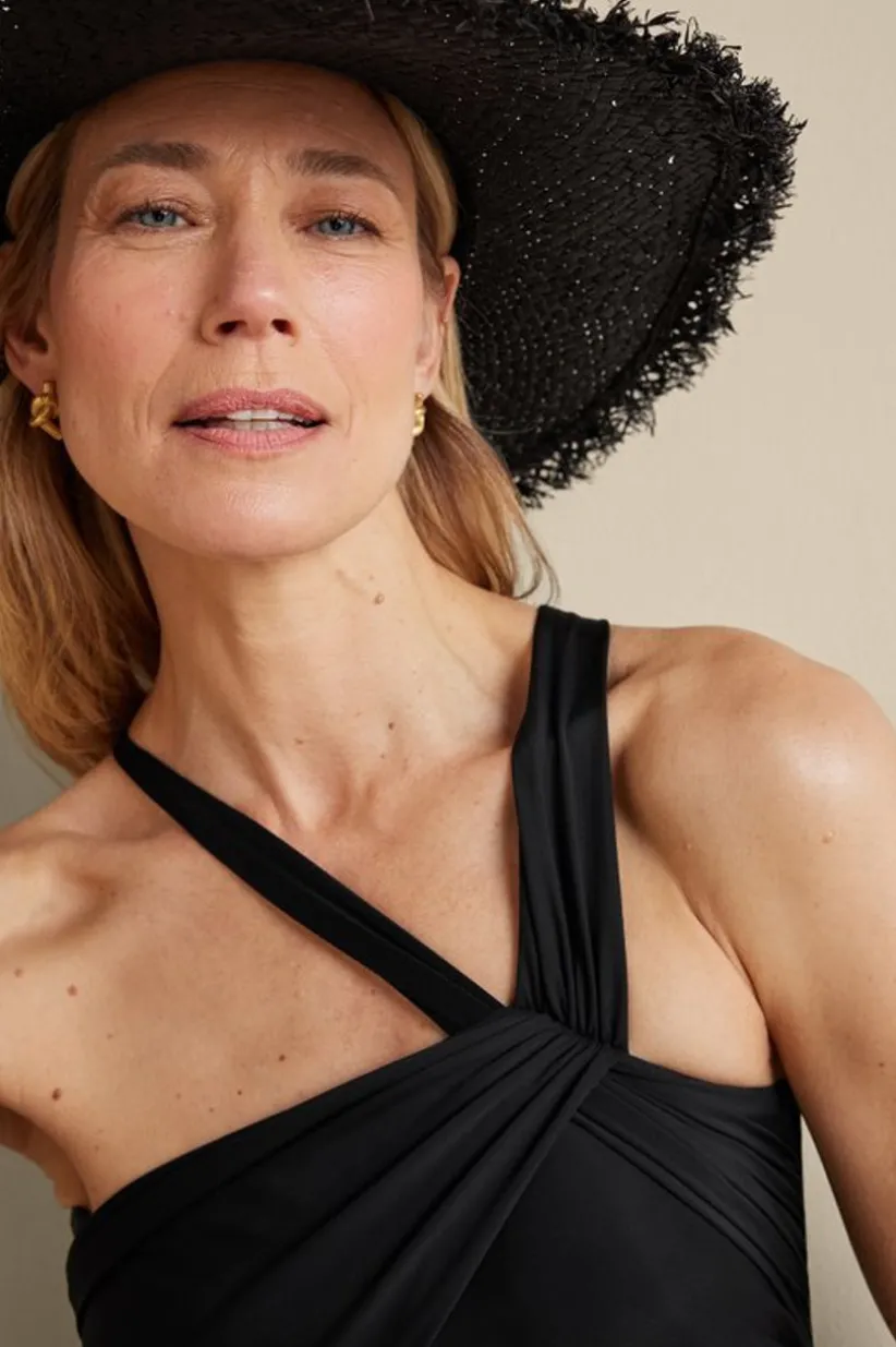 Asymmetrical halter swimsuit brings a new twist to curve control with Miraclesuit’s innovative shapewear technology that…