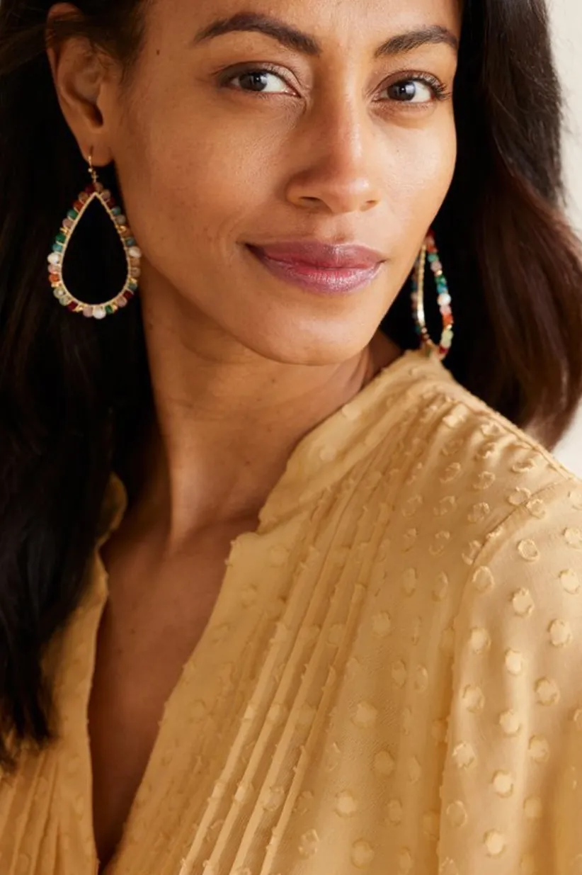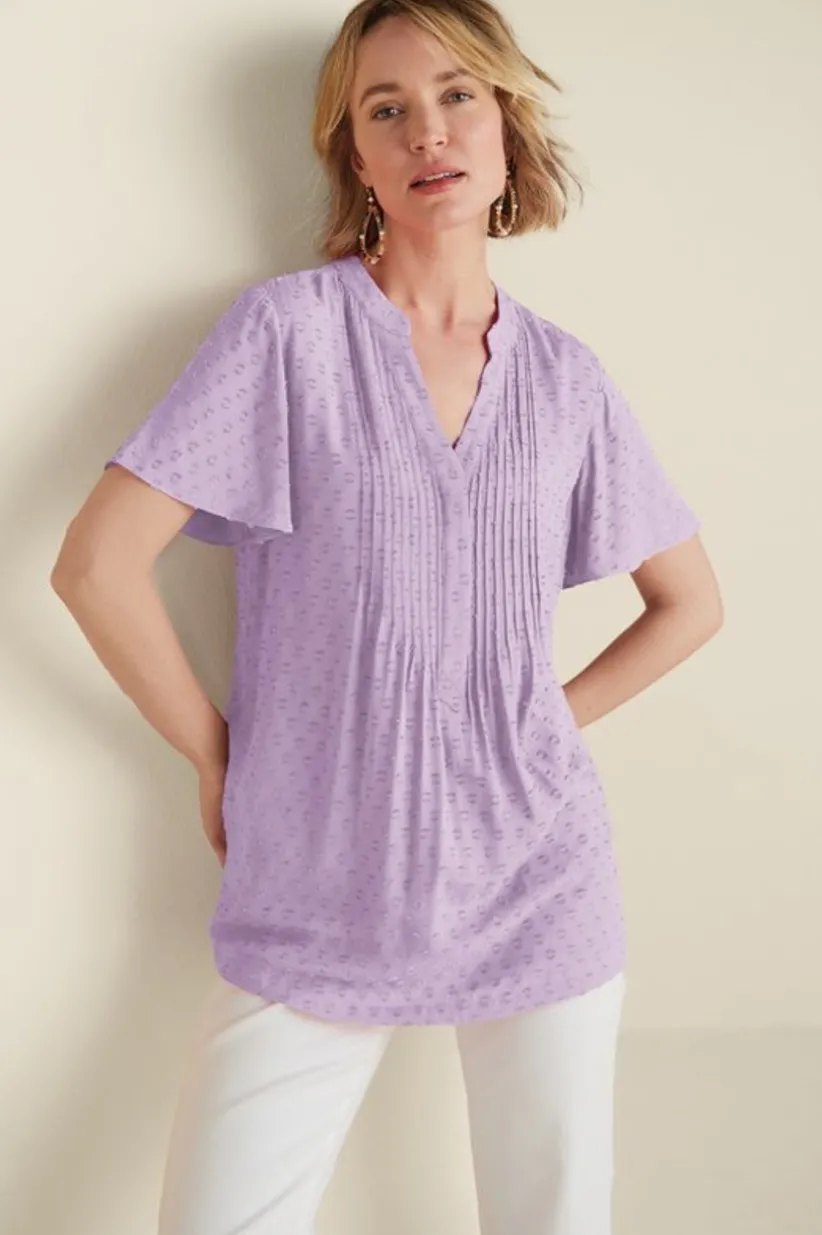 A swingy, flowing top with pleats down the front and back neckline. The shirt has short sleeves and is fully lined.