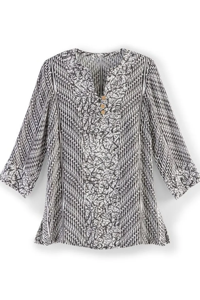 You’ll want to look twice the strategic placement of two bold abstract prints creates visual flattery in one sensational top. This design nips in a touch at the waist to enhance the slimming effect. Button and loop V-neck, 3/4 sleeves.