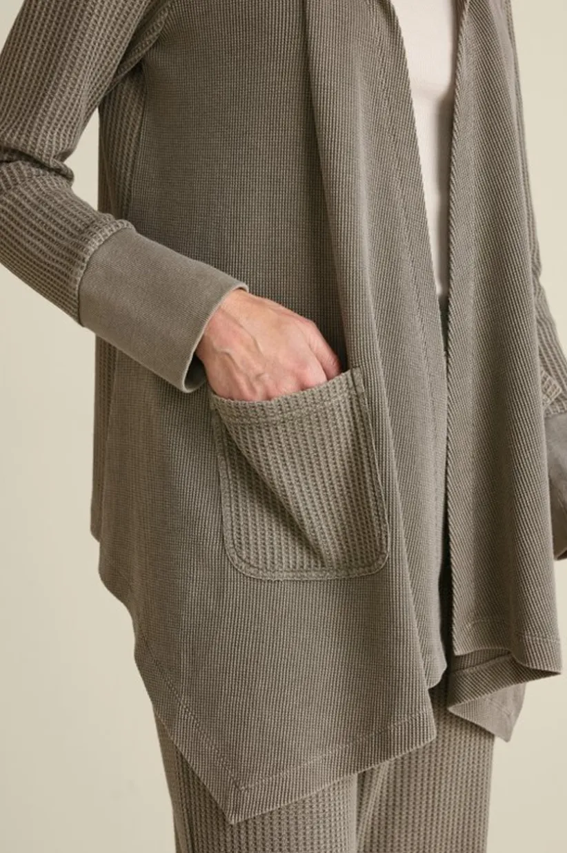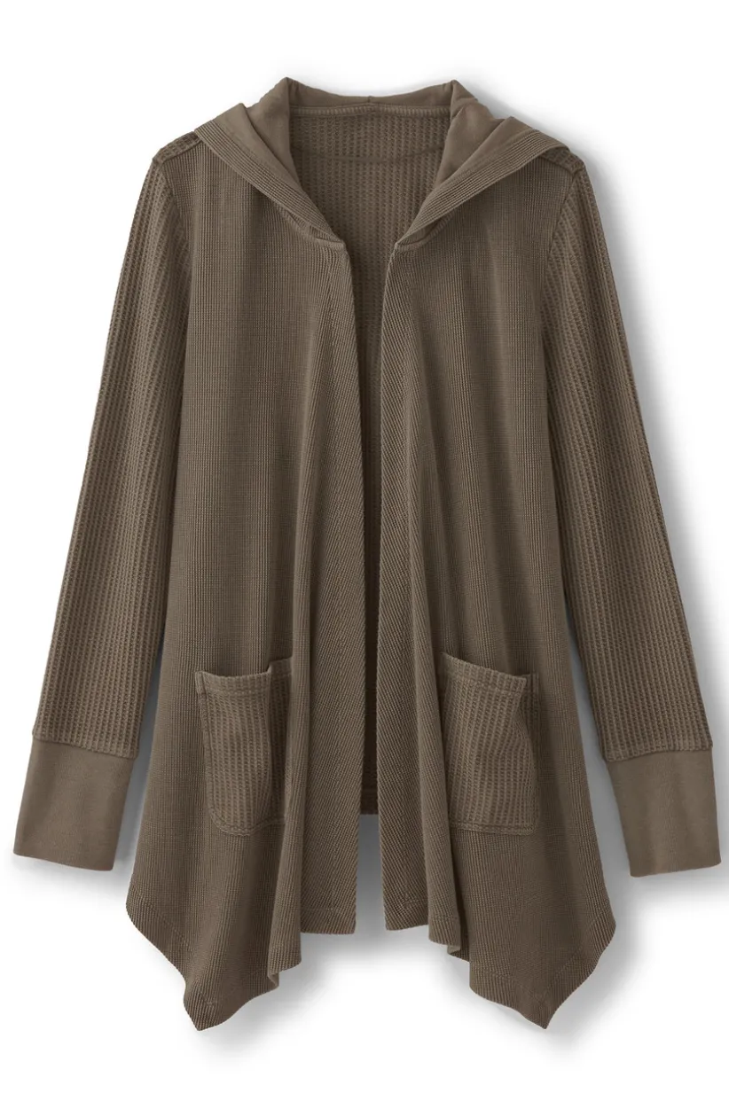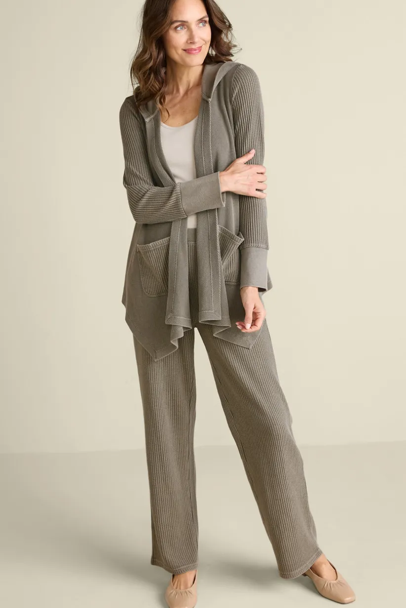 We love warm waffles brunching at home and beyond. Those tiny yet mighty waffle squares trap heat and lock it in when temps dip. Treat yourself to a waffle lot of cozy warmth with this hooded, open-front topper. Deliciously drapey and garment-dyed for a lived-in look and feel, it even boasts patch pockets to keep hands ultra-toasty. Sweeten the deal with the Vala Waffle Pull-On Pants (2GN02).