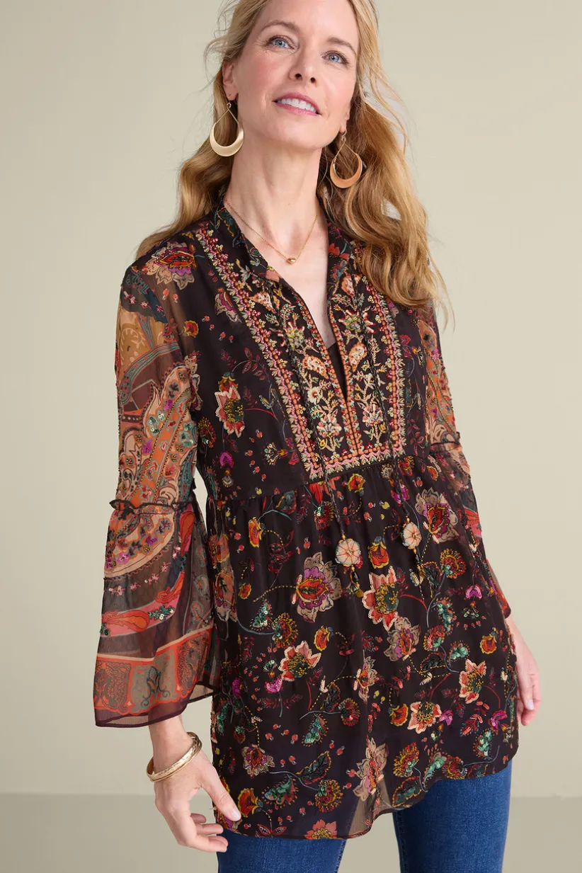Like the goddess of falling stars, Asteria shines. A constellation of prints and embellishment float on the flowy chiffon body and sheer bell sleeves, while flecks of detail dazzle on the embroidered bib.