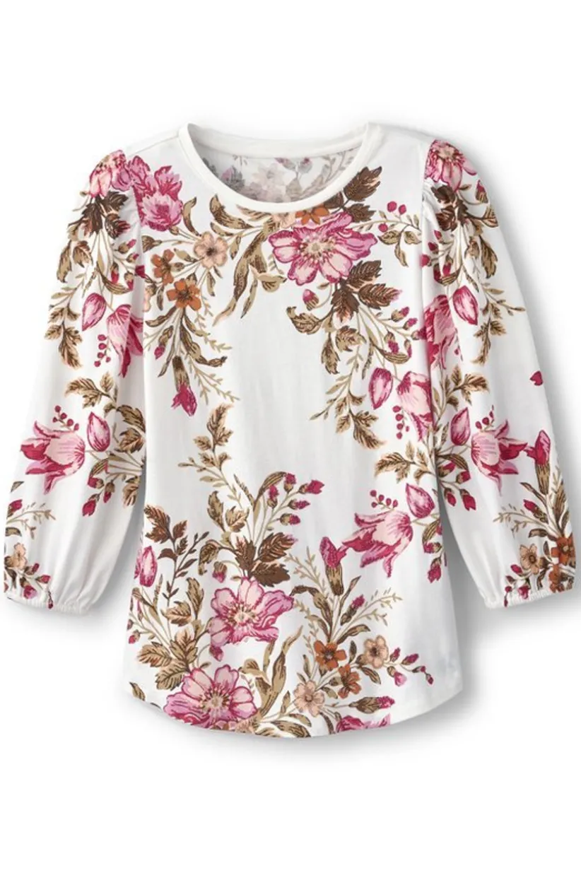 We love the vintage-meets-modern look of this cotton top, which features a scoop neckline and 3/4-length puff sleeves with shirred shoulders. A bold botanical print in shades of pink, red, and olive gains extra vibrancy from shimmering beads and micro-paillettes.