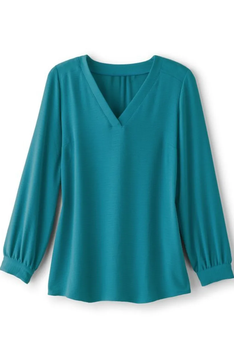 Girls’ brunch or harvest gathering, this tunic flows through them all. Its textured, woven fabric is bound to make waves. While the curved hem and billowy, button-cuffed sleeves effortlessly flatter.
