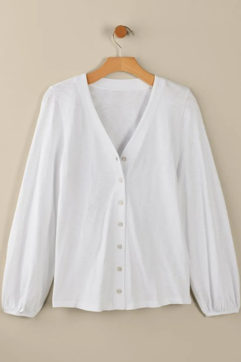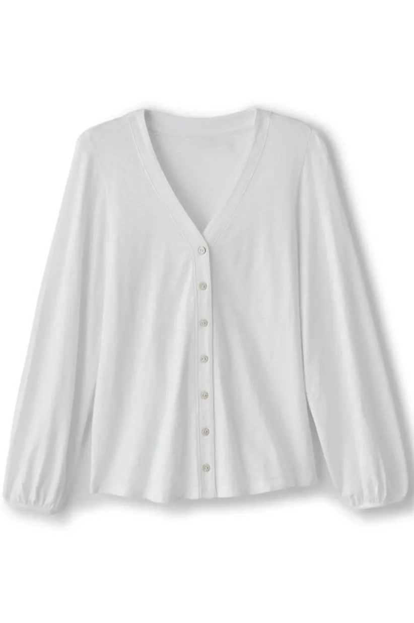 An everyday staple in an easy cotton knit, this button-front style offers a versatile silhouette with a V-neckline and long blouson sleeves.