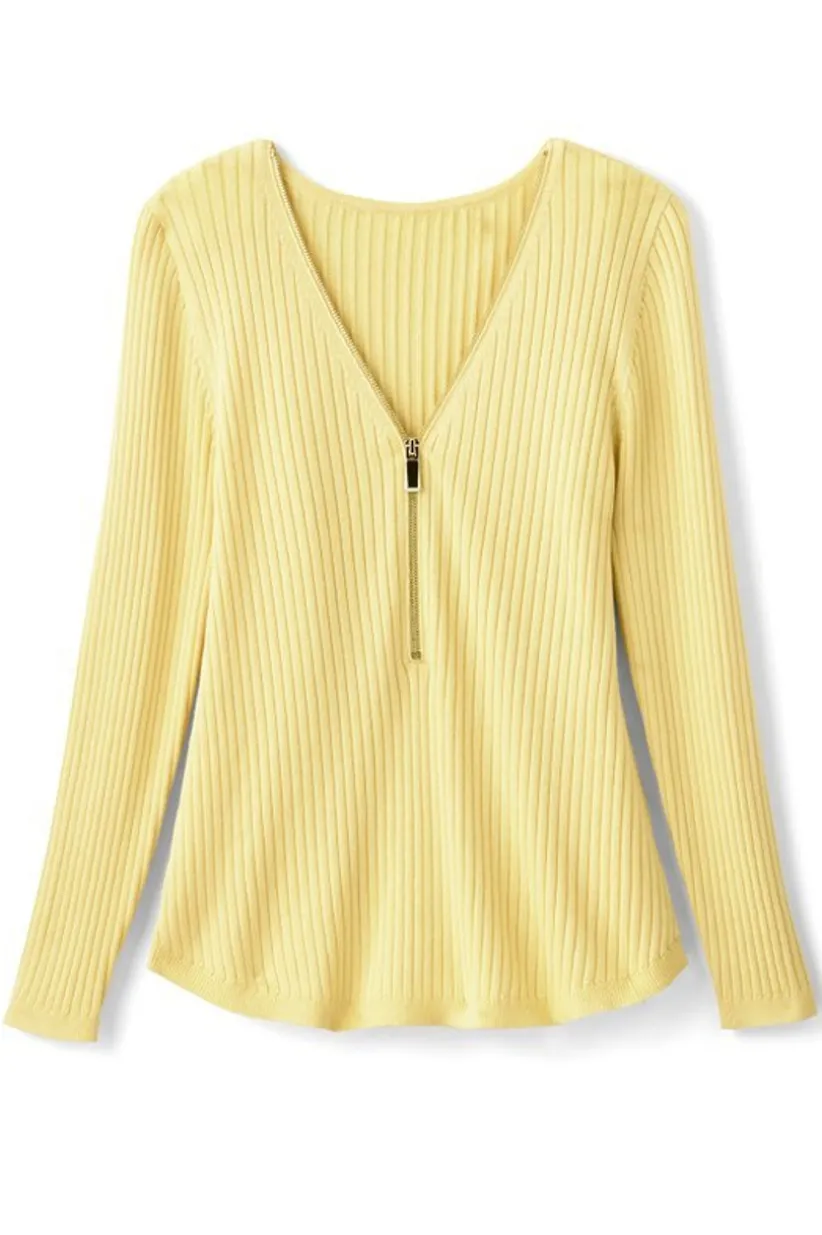 You love this Valentina silhouette. It’s easy and the 3/4 zip with an oversized gold pull adds a brilliant flash of shine at the V-neck. We’ve updated the fabric for a fresh and fabulous new look and amazing feel. The ribbed knit is super soft and polished with a supple inner placket for maximum comfort. Long sleeves, curved hem.