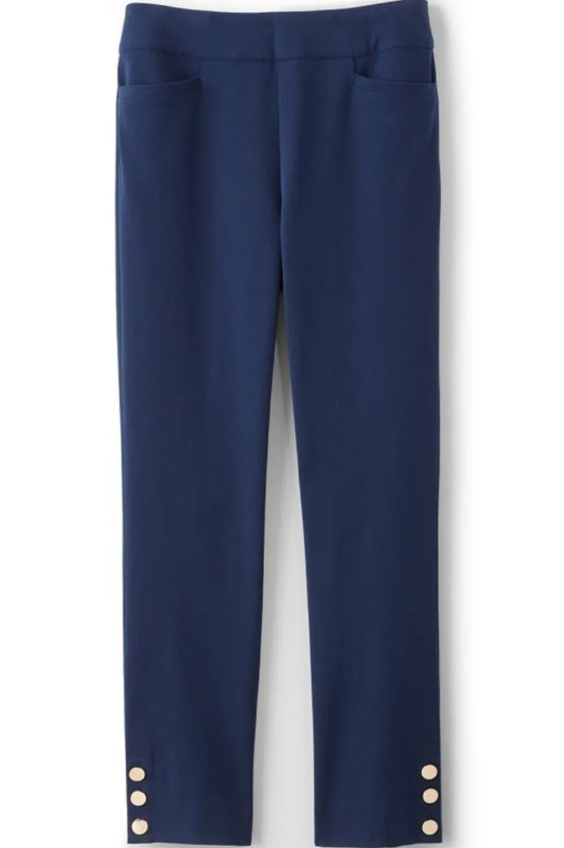 Elegantly finished with gold buttons at the hem, these sleek pull-on crop pants are made from a phenomenal stretch fabric that slims and shapes. A flat, wide waistband and mesh-knit tummy panel combine comfort and subtle shaping. Front J-pockets, decorative back welt pockets. Misses inseam 24.</div>